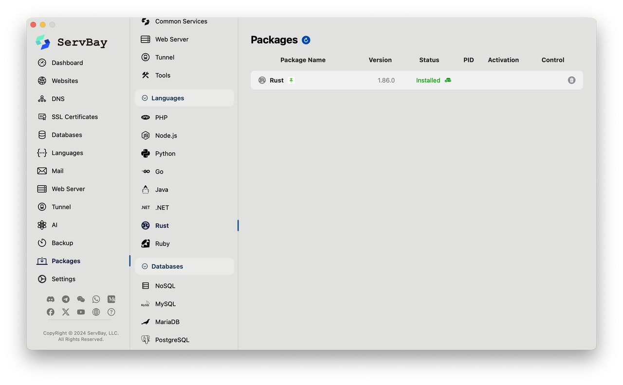 そして今、ServBayはRustのネイティブサポートを正式に統合しました。